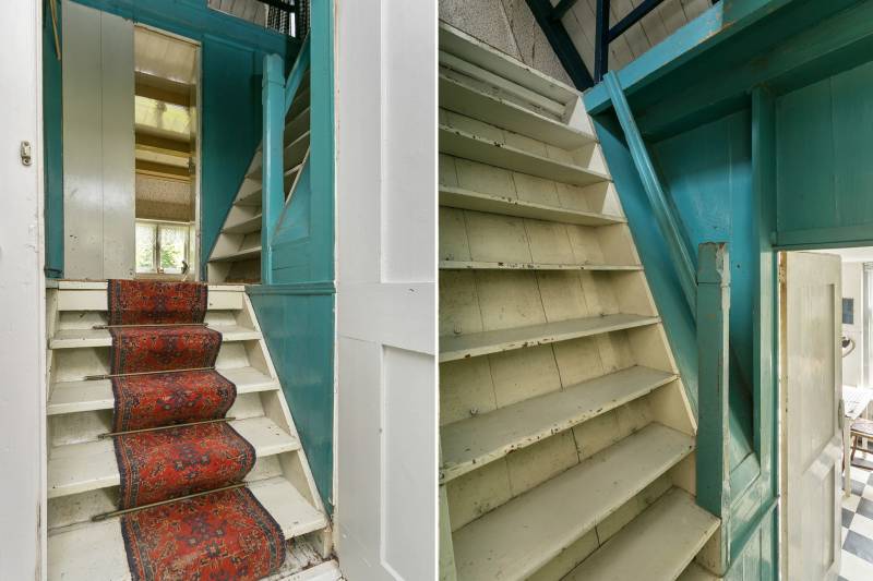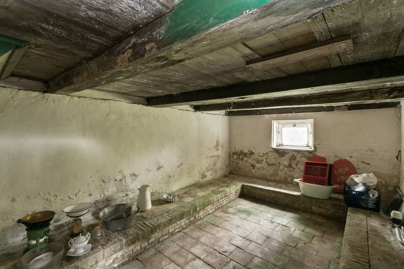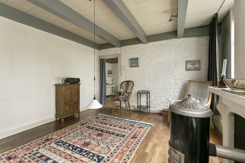 Nog helemaal in de oorspronkelijke staat met zijn estriken op de vloer en met de eeuwenoude balken.