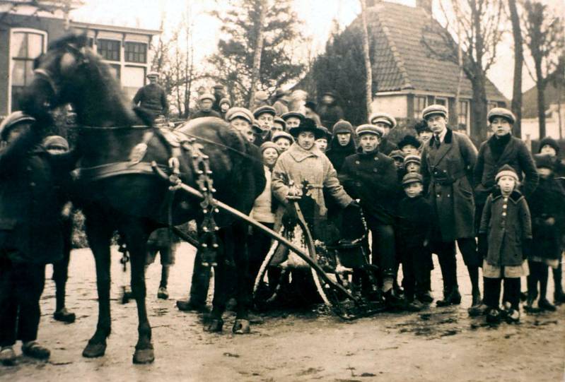 Het jaar van de opname is waarschijnlijk 1929, toen er een strenge winter was. Er zijn toen meerdere opnamen van een arrenslee wedstrijd gemaakt. Ik stuur je er een uit mijn archief, evenals een foto waar het huis met het bartje over de wijk ten oosten van het huis, op staat.