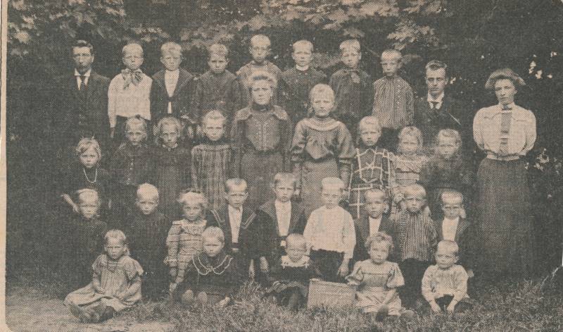 3e rij van links naar rechts: Blijke ??, Hinke Dam, Lipje Velsman, Grietje Dijkstra, Hinke Bosga, Sietse Hofma, Gooitske Hofma ( inzendster van de foto uit Drachten), Geeske Veldman en Grietje van der Vaart.