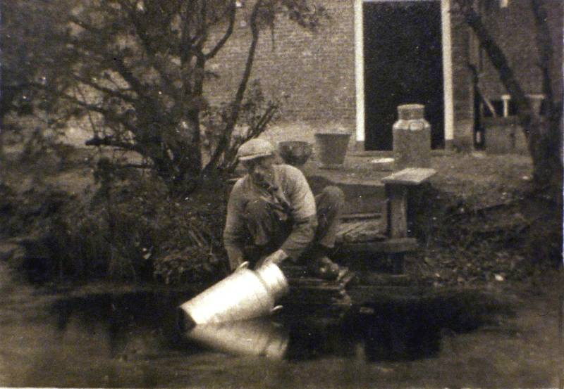 Jouke Woudstra op het boenstap maakte de melkbussen schoon in de wijk naast de boerderij. Hendrik Woudstra woonde op deze boerderij. Adres: Meijerweg 127. Jouke woonde met zijn vrouw Sietske Scheper in een woonwagen op het erf van zijn broer Hendrik.