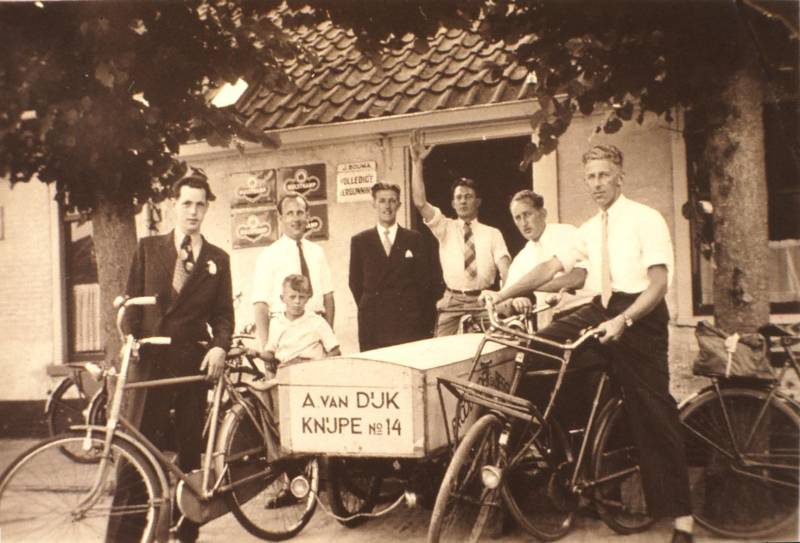 De personen staan hier voor café Bouma met de bakkerskar van Anne van Dijk ( Benedenknipe 14 en later Meijerweg 21. Anne begon met zijn bedrijf op 1 mei 1927). Van links naar rechts: Wiebe Hoekstra, Wieger Hoekstra, Johannes van Dijk ( zoon van de bakker), Oebele Jan Schreur ( beter bekend als Martolini ), Hans Bakker, Siemon Veenema en de topsporter Egbert van der Ploeg ( gymnastiek en schaatsen). Egbert trouwde met Tineke Bosscha, de dochter van cafébaas W. Bosscha van de Veensluis.