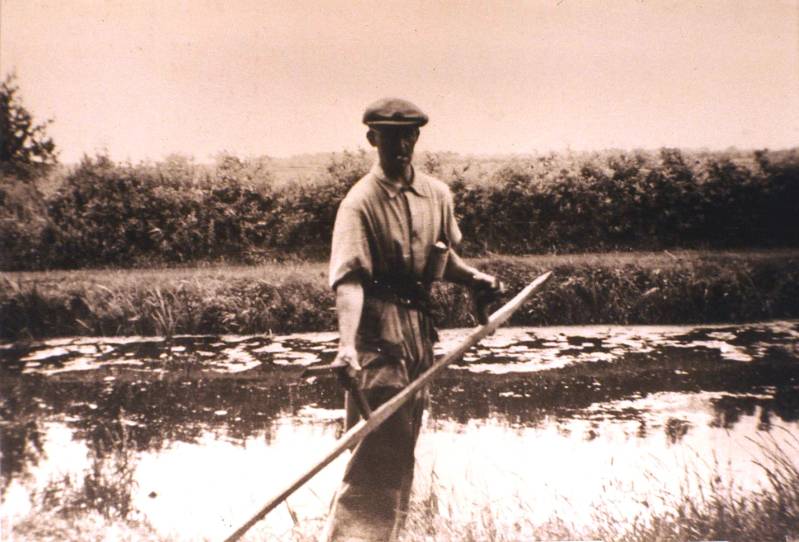 Deze foto is genomen in 1940 . Kees Veldman maaide de berm voor het huis van Abe en Luts de Vries (Dominee Veenweg 145). Kees woonde zelf op Dominee Veenweg 129. ( Gegevens van Geert de Leeuw).