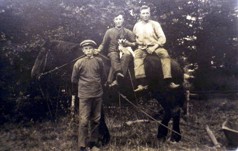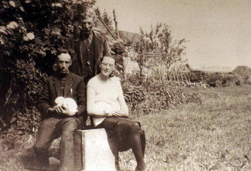 Deze foto is rond 1920. Hij is waarschijnlijk genomen bij de boerderij op Dominee Veenweg 215; waar de familie Trinks nu woont. Van links naar rechts: Arend Heida ( hij geniet van zijn pijp), Feike van der Wal met de hond Nellie en Barteld Haanstra.