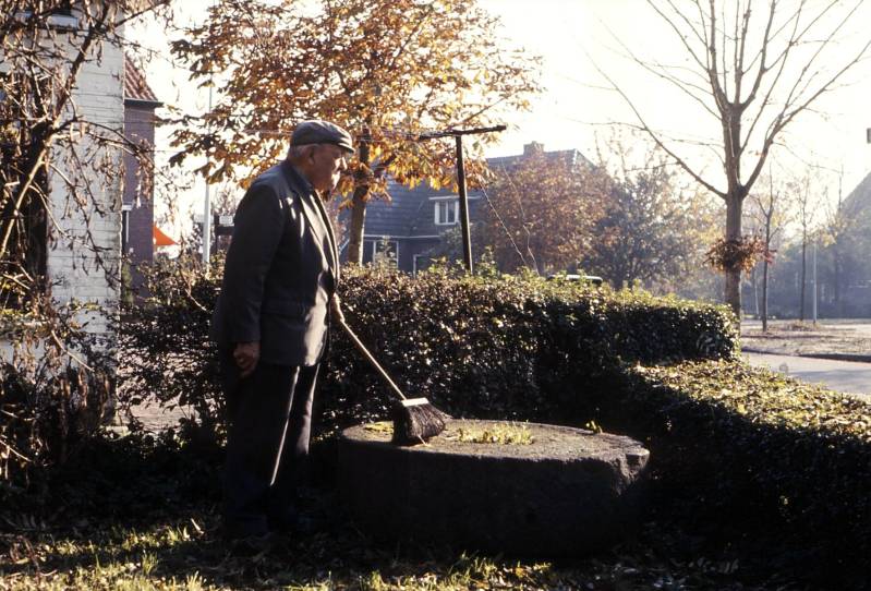 Oktober 1984. Smid Bijlsma uit de Tijnje bij de molensteen uit de zuivelfabriek in de Bovenknijpe. Behalve een zuivelfabriek was het ook een maalfabriek. Hij kocht hem voor 25 gulden en moest voor het vervoer nog eens 25 gulden betalen. Het vervoer ging langs het kerkepad naar Langezwaag en daarna richting de Tijnje.