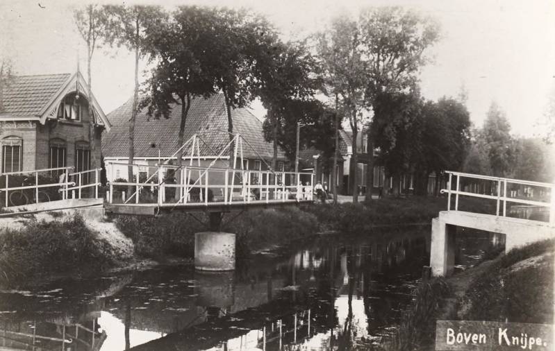 Deze foto is genomen in 1910. De schoolbrug in de Bovenknipe. Links het huis van de hoofdmeester. Daarnaast de boerderij waar de familie Bottema gewoond heeft. Eerst was het adres Bovenknipe 36 en later 34. Johannes Bottema was veehouder. Op 12-5-1878 kwam de familie Bottema van het Meer naar deze boerderij en in 1882( het jaar dat Tjerk werd geboren) gingen ze naar Langezwaag. Tjerk Bottema werd een beeldend kunstenaar. Hij werkte niet alleen in Nederland maar ook in vele andere landen: onder andere in Frankrijk en Italië . Op 21 juni 1940 kwam Tjerk om het leven in Het Kanaal, toen het schip waarop hij zat werd getorpedeerd. Zijn broer Tjeerd was eveneens een bekend kunstenaar.