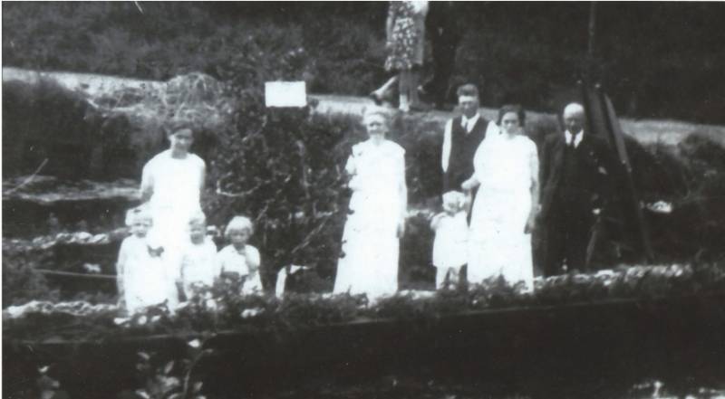 De fam. Brouwer in de tuin achter de winkel op Ds. Veenweg 43. Dochter Tine trouwde later met Dijkstra en woonde naast de zorgboerderij.