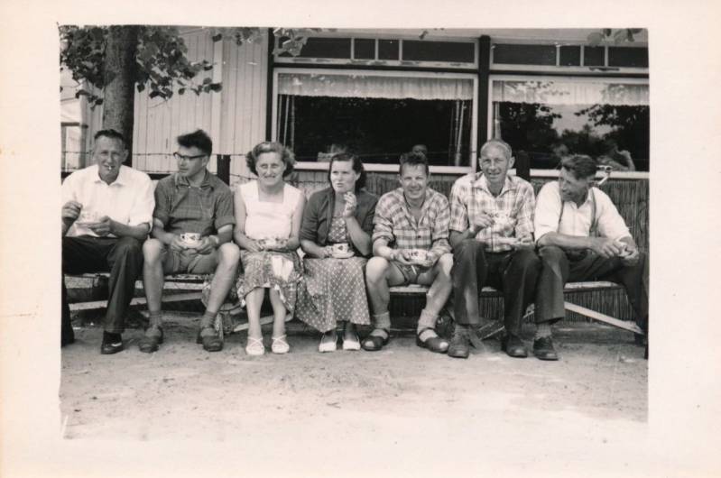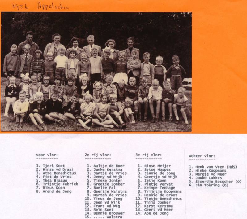 1959- Schoolreisje van de school in Bovenknipe naar Paterswolde. Op de foto begeleiders en onderwijzend personeel: van links naar rechts: J. Koen, H. van der Veen ( hoofd der school), Sjoerdje Bosscher ( onderwijzeres), Hes Kerstma, J. Toering ( onderwijzer), Jan Kerstma en Meine Wever.