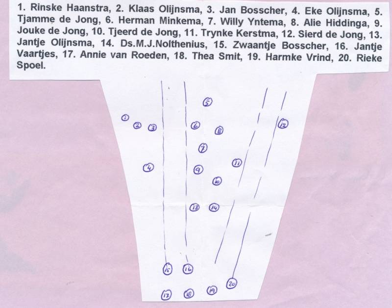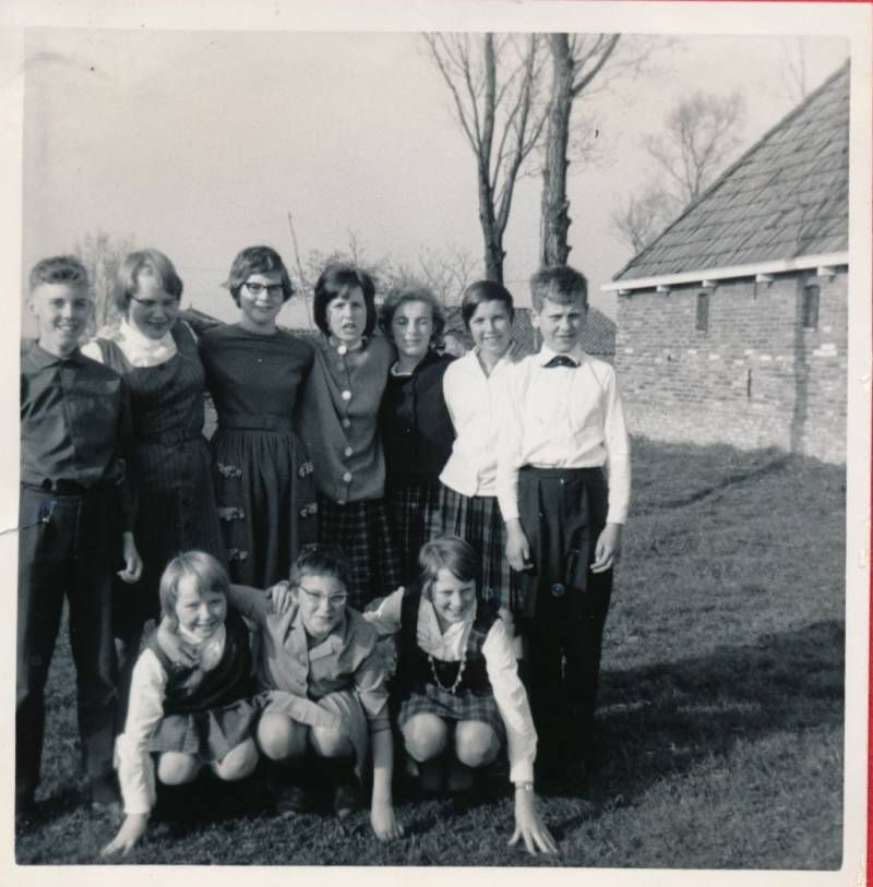 Deze foto is door Janke Kerstma in 1965 gemaakt naast het ouderlijk huis. Zij en haar tweelingbroer Kerst werden toen 15 jaar. Staand van links naar rechts: Kerst Kerstma, Imkje Trinks ( Ds Veenweg 215), Aaltje de Boer ( Jan Jonkmanweg 1), Tietje Benedictus ( Ds Veenweg 51), Jantje Vervat ( Ds Veenweg 47), Annie Minkema ( Ds Veenweg 52) en Tjeerd Benedictus ( Ds Veenweg 51). Op de hurken van links naar rechts: Willie Trinks ( Ds Veenweg 215), Nienke Niezing ( Ds Veenweg 57) en Annie Krikke ( Ds Veenweg 14). Imkje en Willie zijn zussen. Tjeerd en Tietje zijn broer en zus.