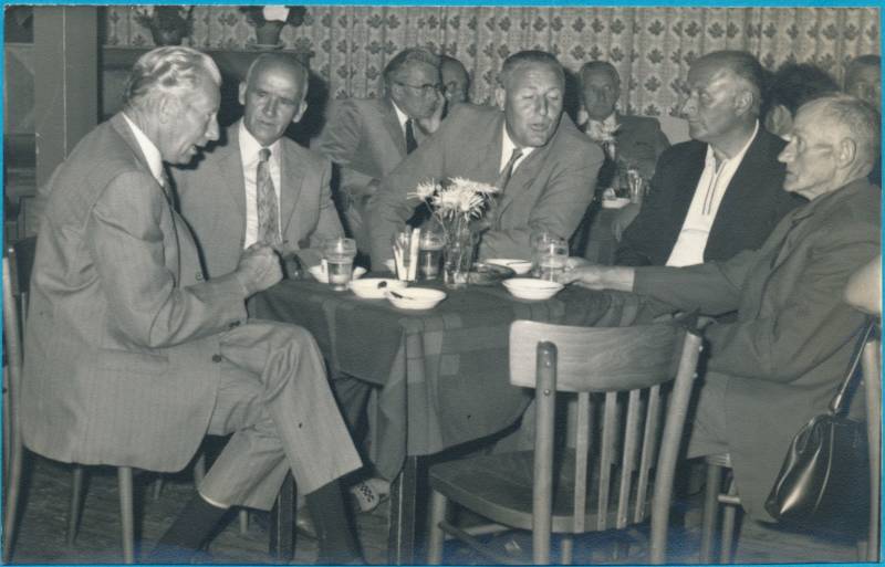 5 augustus 1964. Op 15 en 16 augustus ging Kinea het 40-jarig bestaan vieren. Op de foto is de commissie druk bezig het een en ander te regelen. Van links naar rechts Minke de Jong ( secretaresse) , Anneke Aardema, Tjee Bijker ( penningmeester) , Bontje de Groot ( wedstrijdsecretaresse adspiranten ), Abe de Vries ( voorzitter) en Geert K. de Leeuw ( wedstrijdsecretaris senioren). Tjee Bijker heeft zich geweldig ingezet voor Kinea. Op 14 juli 1978 overleed Tjee helaas erg jong: op 47-jarige leeftijd.