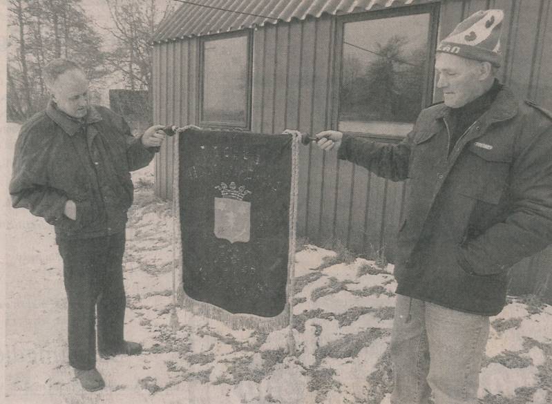 De ijsclub Eensgezindheid bestond in 1996 125 jaar en vierde het feest in café de Knyp. De spreker daar was Jeen van den Berg ( de bekende Elfstedenschaatser). Links: bestuurslid en eigenaar van de ijsbaan Tiede de Glee ( hij wilde geen huur voor de ijsbaan) en rechts voorzitter Sietze Durkstra. Zij hebben het vaandel van de ijsclub ( van 1888) teruggevonden. Het was 25 jaar zoek.