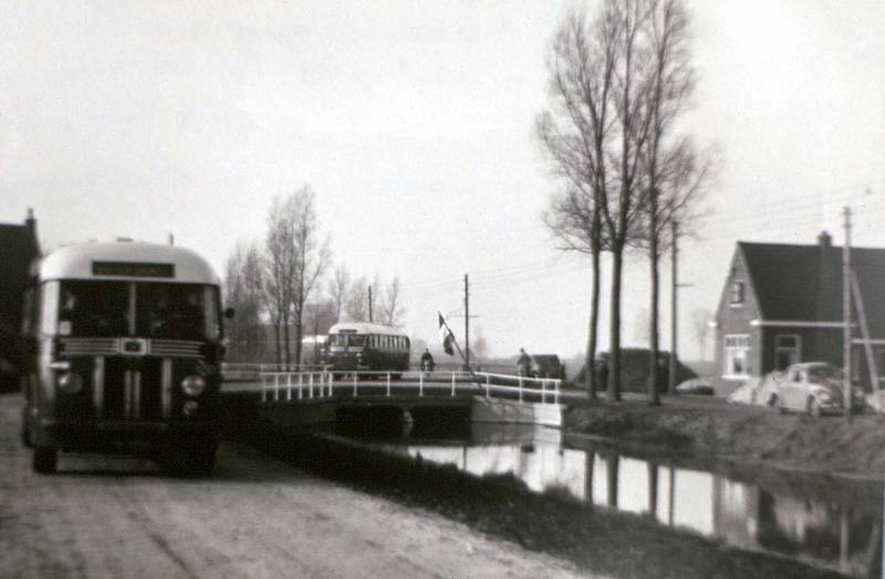 1955 - Feestelijke opening van de weg door de Bovenknipe ( van Heerenveen naar Moskou ( bij Hoornsterzwaag)). De foto is genomen bij de overkluizing. In het huis rechts ( Ds. Veenweg 11) woonde toen de fam. Jouke Lukkes. Nu de fam. Tjamme van der Meer.