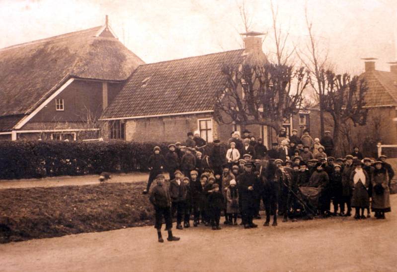 Deze foto is rond 1950 genomen: Dominee Veenweg 53A - het huis van de familie Meine de Boer. Het huis is al lang geleden afgebroken. Van 1925 tot 1930 woonde hier de schipper Sietze Koen. Op de achtergrond Akke ( echtgenote van Meine). Links op de voorgrond Ypie en rechts Foppe.