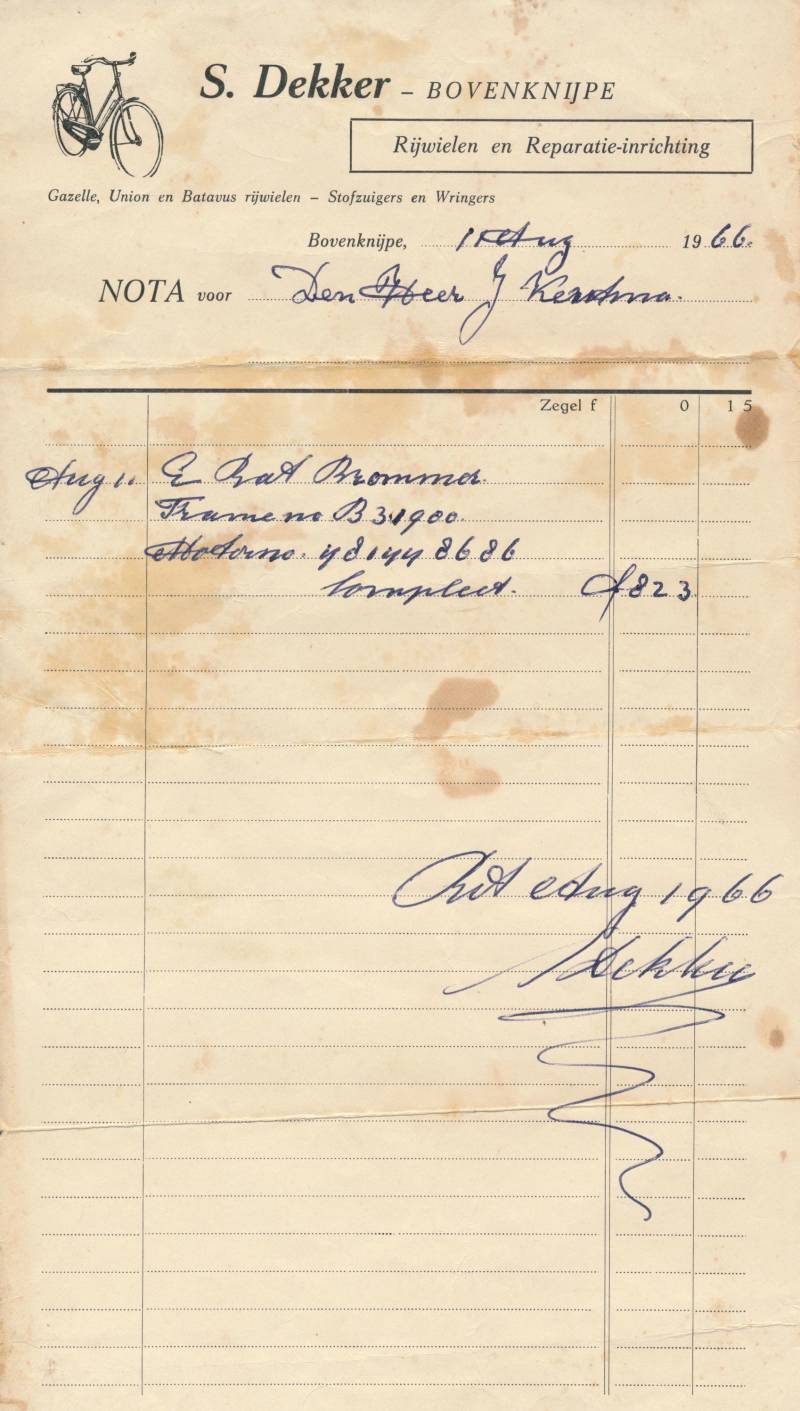 Een rekening van Siebe Dekker uit 1966. Jan Kerstma kocht een Batavus-brommer bij hem.